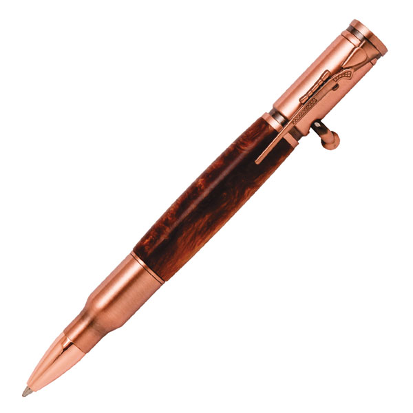 The unique Antique Copper Bolt Action pen is perfect for any hunting enthusiast! The realistic bolt-action handle smoothly advances and retracts to securely lock the refill in place. This kit includes a bolt action rifle clip and a replica 30 caliber cartridge and rose gold bullet tip for added authenticity.