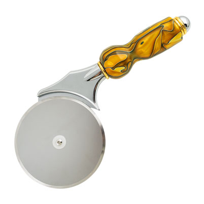 Cut your pizza with style and ease with this deluxe pizza cutter! Made with a durable, stainless steel cutter and heavy-duty chrome components, this cutter will impress and perform. The 24kt gold plated washers add an elegant, beaded appearance to your turned handle. It's easy to wash as the threaded insert allows you to conveniently remove the cutter from the handle. Easy to make - just turn between centers to the length of your choice. 4" Stainless Steel Blade and a Chrome finish.