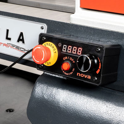 Electronic Braking: A fundamental part of woodturning is stopping a moving workpiece, examining the cut and shaping progress. Stopping the lathe quickly saves time and is safer than the operator using their hand on the hand wheel or workpiece. With Nebula, you can brake quickly and safely: adjustable electronic braking is set in the menu – from a soft 1% to a substantial 19%.