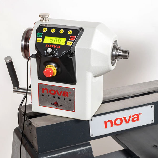 Explore new frontiers in woodturning with Nebula, the new 2.5HP lathe with smart, direct-drive motor technology from Nova that’s redefining what a full-sized lathe can do. Nebula goes far beyond any other lathe in its class: just a twist of a knob and speed can be adjusted from 100 rpm up to 4000 rpm with no sacrifice in torque. Nebula’s outstanding machine features and specifications include a 360-degree pivoting and sliding head, an 18” (457mm) over bed swing, 35” (890mm) diameter capacity outboard (with optional outrigger kit), and 25” (635mm) between centers. Whether you’re turning large projects or small, Nebula’s unparalleled, smart motor technology from Striatech has an easy-to-use, software-driven controller and provides the ultimate in smooth performance, intelligent control, and power under load.