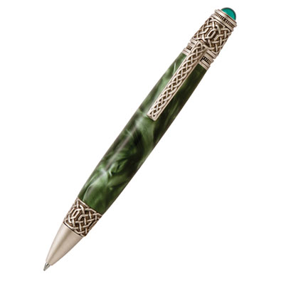 Honoring the Celtic heritage, this pen kit features intricate Celtic Knot scroll work on the tip, clip and end. The antique pewter finish combined with the twist knot design, depict the era well. An emerald color cabochon tops off the end and gives it a unique flair. The Celtic would look great with an Inlace Acrylester blank - PBIA53, Emerald Green.