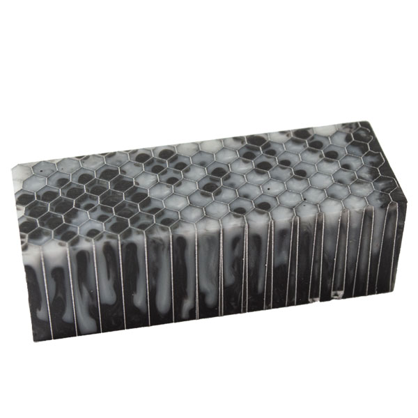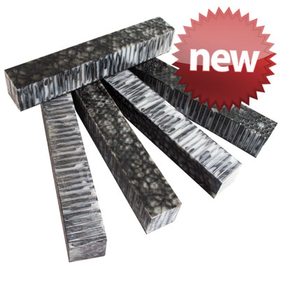 Our Combz blanks are a combination of beautiful two-tone pearlescent resin and aluminum honeycomb. They are a really cool look when finished!