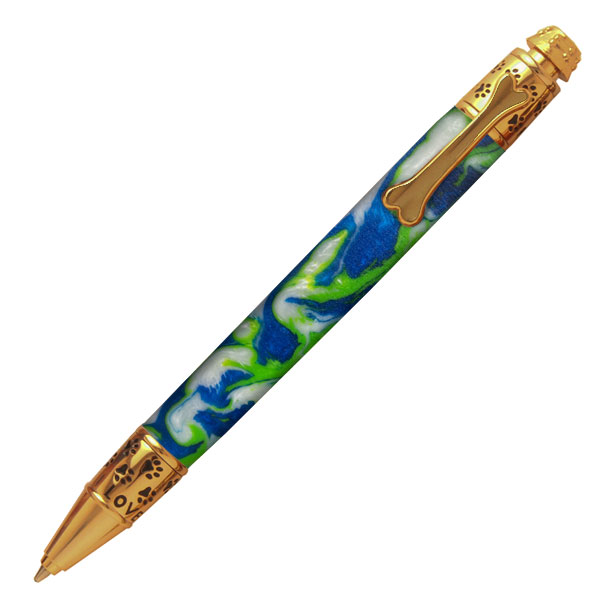 Carry a reminder of your furry friend wherever you go! This pen has lots of details to do just that! The click top is cast into the shape of a dog bowl. Displayed prominently, the spring clip is none other than a dog bone. Helping to complete the look, there are paw prints engraved on both the top and bottom of the pen. Additionally, the words "I LOVE MY DOG" are engraved around the bottom of the pen tip. Easy to make with a single 3/8 inch tube and smooth writing with a Parker style refill.