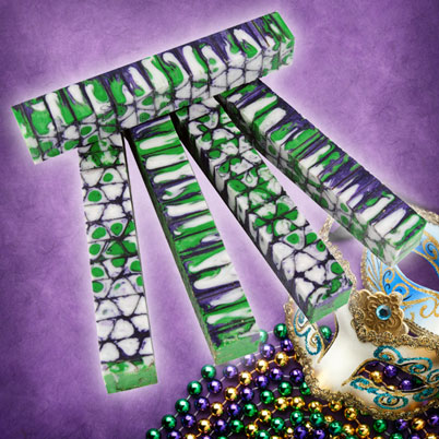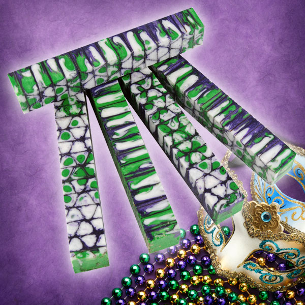 The Mardi Gras Genesis pen blank is a sharp combination of purple, green, and white! This cellular composite is an Inlace Acrylesterâ„¢ variant with enhanced color effects and a truly unique look. The organic mesh used to structure the blank offers improved workability and outrageous color fusion!