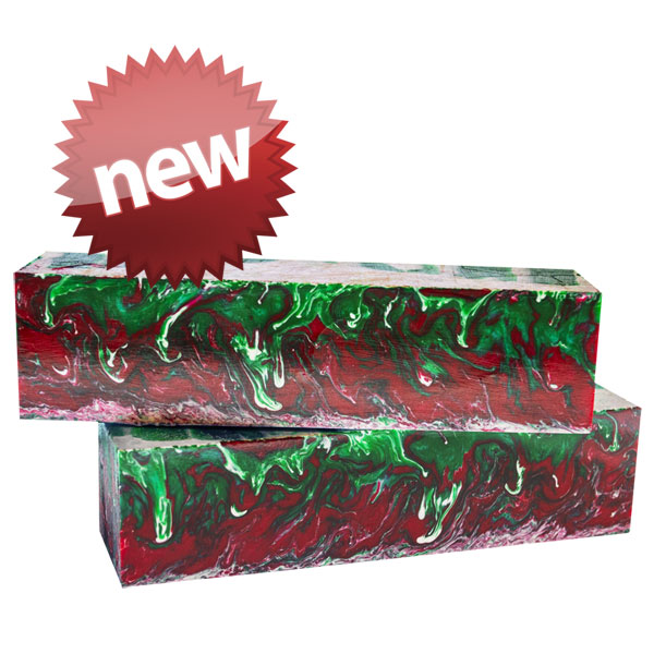 Yuletide Inlace Acrylester spindles are composed of a beautiful red, green, and a glittery white pearl, which blend and swirl together to make a great holiday color! The blanks are 1.5" square by 6" long and will work well for your larger projects.