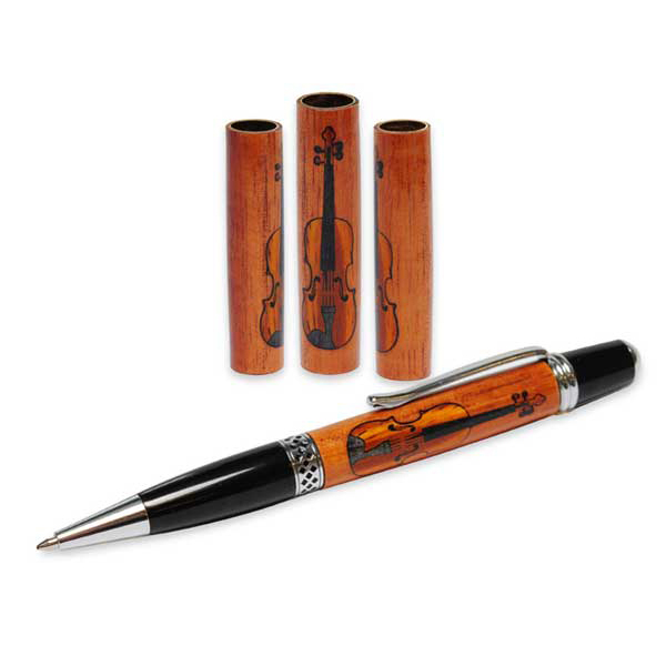 Great for the music lover, this violin kit fits the Mesa pen kit. The Violin Inlay Kit is made up of Black-Dyed Spalted Maple, Curly Maple, and Koa with a total of 5 pieces. This kit was designed for the Mesa and Magnetic Vertex (PKFP5XXX) Pen Kits. Just follow the included directions, glue and turn!