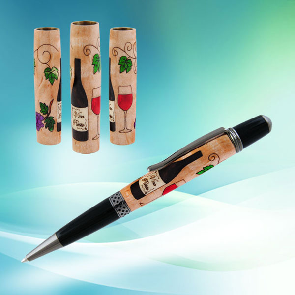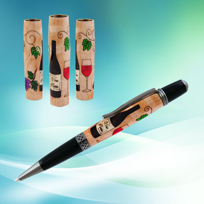 This kit is great for any wine lover! This fourteen-piece kit is made from holly, blackwood, purple-dyed basswood, green-dyed boxelder burl, red-dyed boxelder burl, and cocobolo. It has been designed to fit the Mesa, Lancer, and Magnetic Vertex (PKFP5XXX) Pen Kits. Just follow the included directions, glue and turn!
