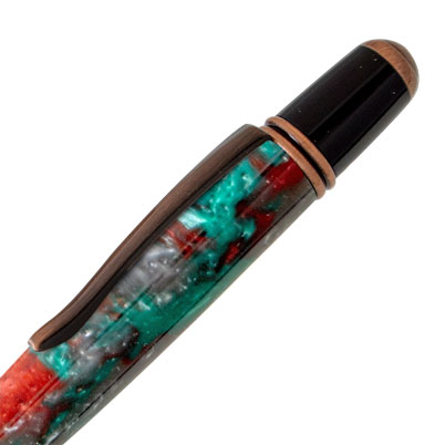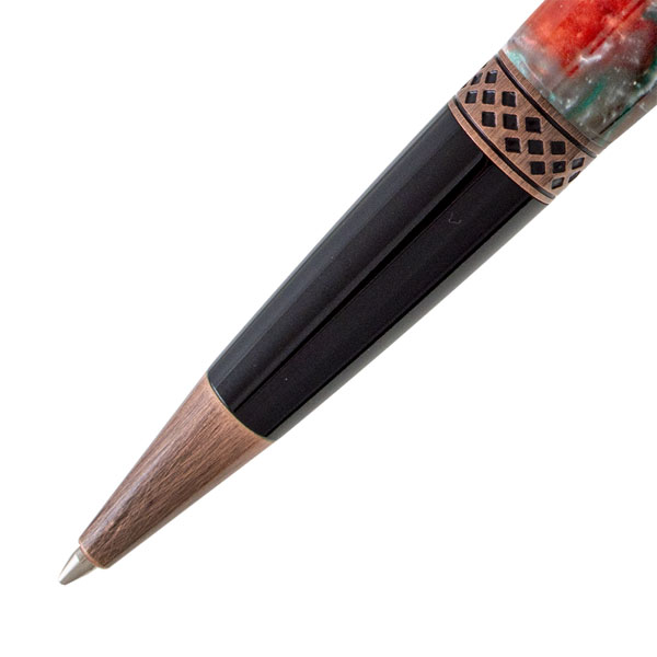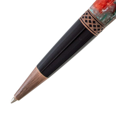 This one-piece twist pen is similar in styling to the Sierra & Gatsby, the lower band has rows of inlaid black diamond shapes. This is a really elegant and intricate-looking pen comes in Antique Copper, but is available in multiple finishes. (Uses 27/64" drill bit)