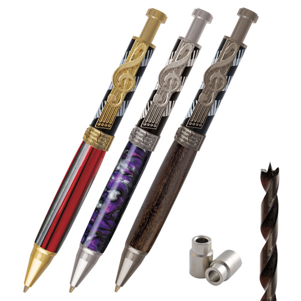With its piano keys encircling the upper barrel, musical staff center band, and treble clef pen clip, this kit will appeal to any music lover! It has a simple, modern design and smooth click mechanism which makes it feel like a dream! It displays plenty of barrel area and is the perfect pen to use those exhibition blanks.