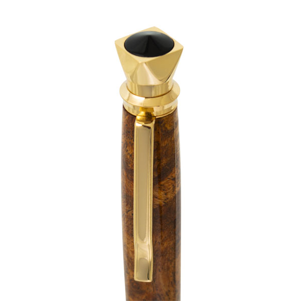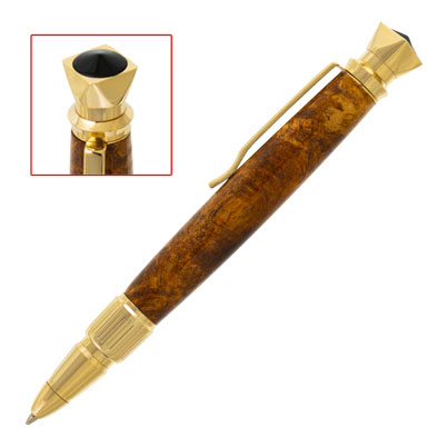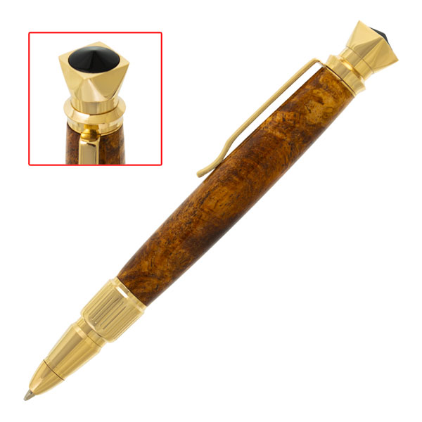 Discover royalty in every stroke of the Regalia Pen Kit. Shown here in Gold. It showcases a faceted top adorned with a black cabochon accent fit for a king or queen. The nib features a stately design that is ergonomic and upscale. Regalia’s one-tube design makes it easy to turn and press together. Use wood, acrylic, or our Inlace Acrylester blanks to create a noble creation that will be used and loved for years. A Parker refill ensures smooth and clean ink flow.