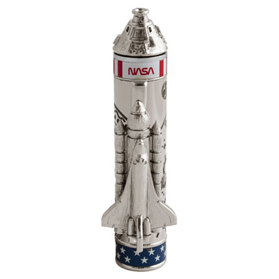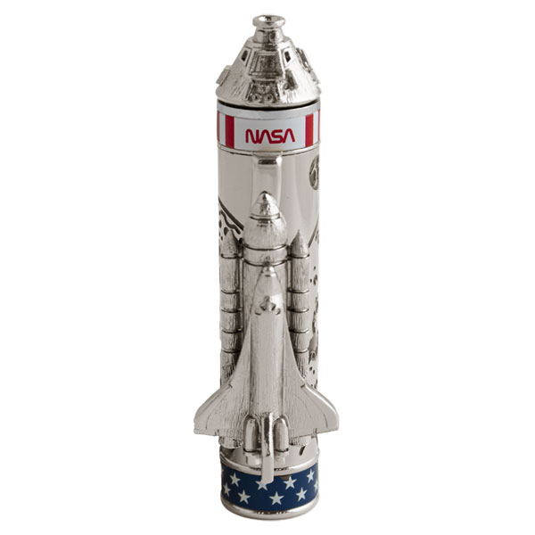 T minus 3..2..1..Liftoff! Our Shuttle Rollerball pen in chrome has launched! The Space Shuttle orbiter is the main attraction of this pen and adorns the clip for a look that makes a shirt pocket stand out from ordinary pens. On top of the cap is a capsule inspired by the Apollo Command Modules. The bulk of the cap features an astronaut over the lunar surface which is flanked by stars, stripes, and the NASA “worm” logo. This is one of our coolest pens that we’ve ever offered and has a phenomenal look overall.