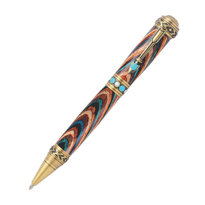 This pen is perfect for anyone wanting a pen with an American Southwestern flair! This kit features a Desert Mesa flower on the top of the pen and a stylized arrow clip. The finish is a quality brass plating and chemically darkened it to simulate aged brass.