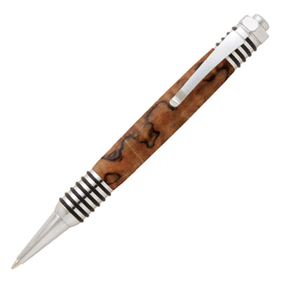 The Industrial looking pen will impress anyone! The ten O-rings compliment the industrial look while providing an easy-to-hold, comfortable writing experience. The style also allows for a larger barrel which shows off more of your turned blank. The Spartan uses the same smooth action, quiet mechanism found in the Vertex click pen.