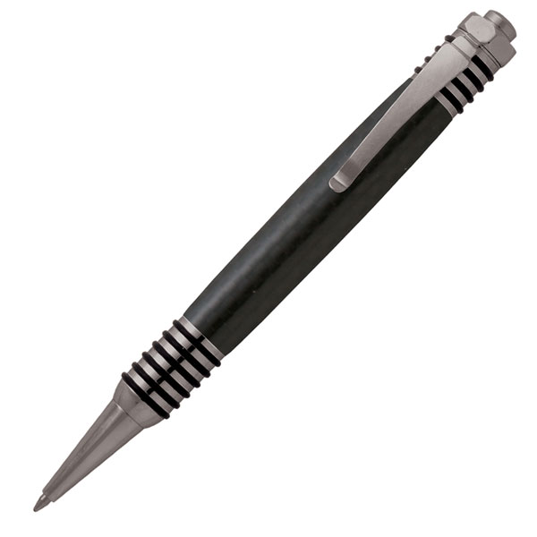 The Industrial looking pen will impress anyone! The ten O-rings compliment the industrial look while providing an easy-to-hold, comfortable writing experience. The style also allows for a larger barrel which shows off more of your turned blank. The Spartan uses the same smooth action, quiet mechanism found in the Vertex click pen.